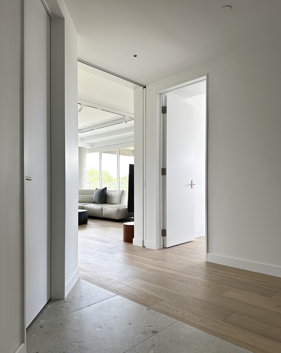 The journey begins in the entrance, where terrazzo porcelain flooring lays a warm welcome underfoot, subtly transitioning into more communal spaces.