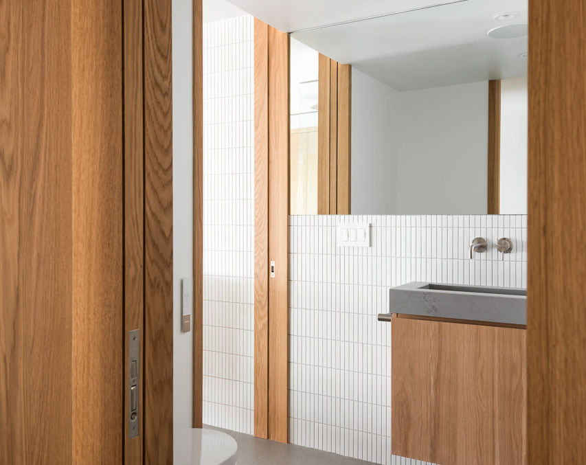 The private area of the apartment continues the theme of light and openness. The bathroom is designed with glass walls to allow natural light to flow through, avoiding the closed-off feel of a typical corridor. This transparency brings a sense of continuity and openness, allowing the resident to enjoy views of the Old Port while using the space.